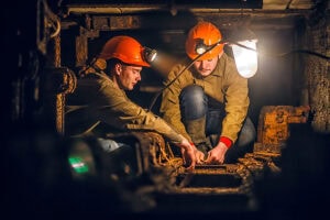 Two Miners In The Mine. A Tired Miners In A Coal Mine Looks At T