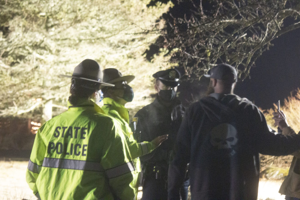 State and local police confront protesters outside the Newfields home of N.H. Gov. Chris Sununu on December 28, 2020. (CREDIT: Chris Maidment)