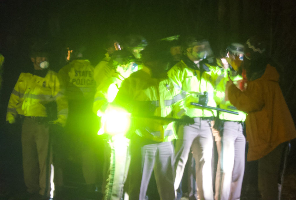They continued their impromptu march back up the street and around the cul-de-sac, where troopers again engaged them. Another dozen state police vehicles then rolled in, with some officers in riot-gear helmets and carrying batons.